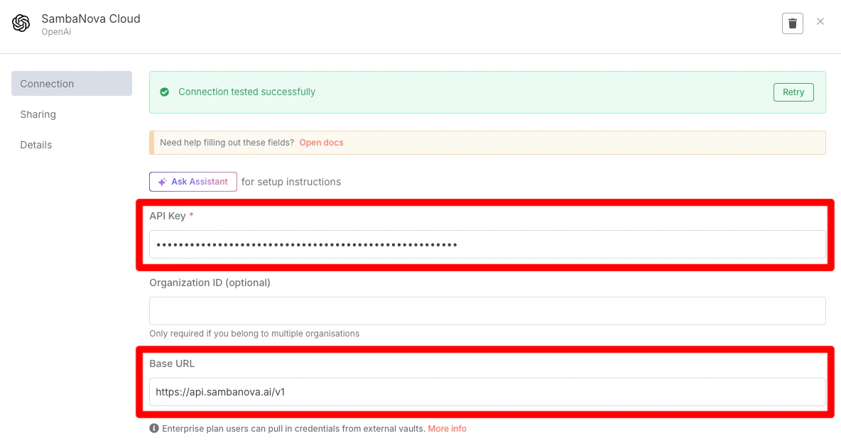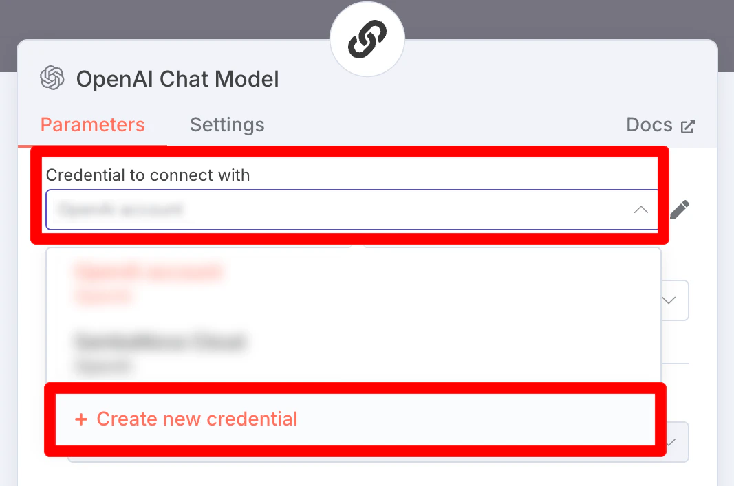 In the OpenAI Chat Model panel, select the “Credential to connect with” dropdown, and select “Create new credential”. Then, enter your SambaNova API Key and Base URL.