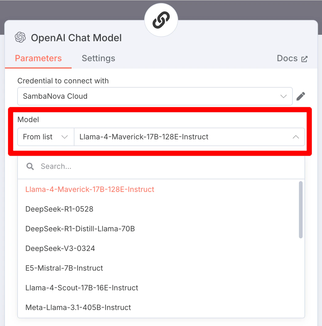 Click the Model dropdown and select the appropriate model provided by SambaCloud.