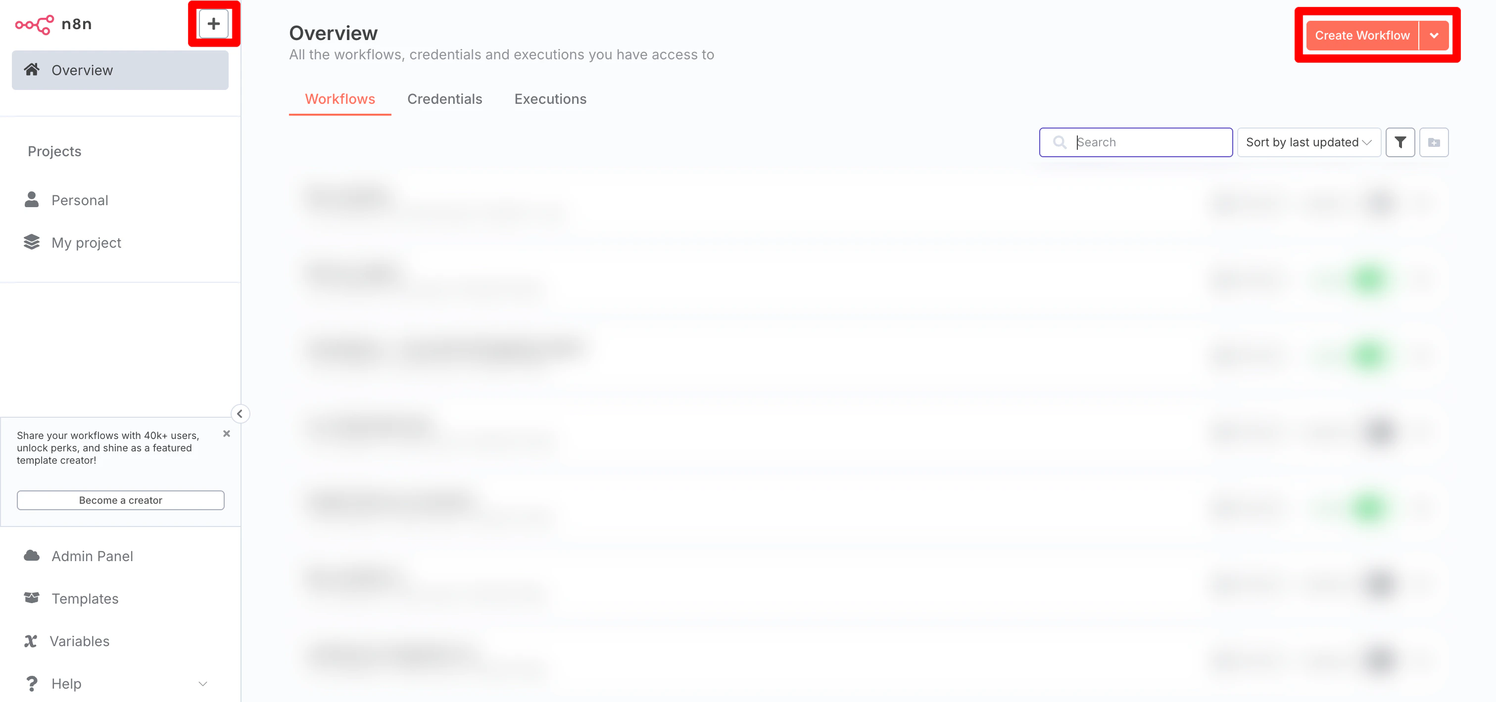 Log in to the n8n platform and select the [+] button. Alternatively, select the Create Workflow button to start a new workflow.