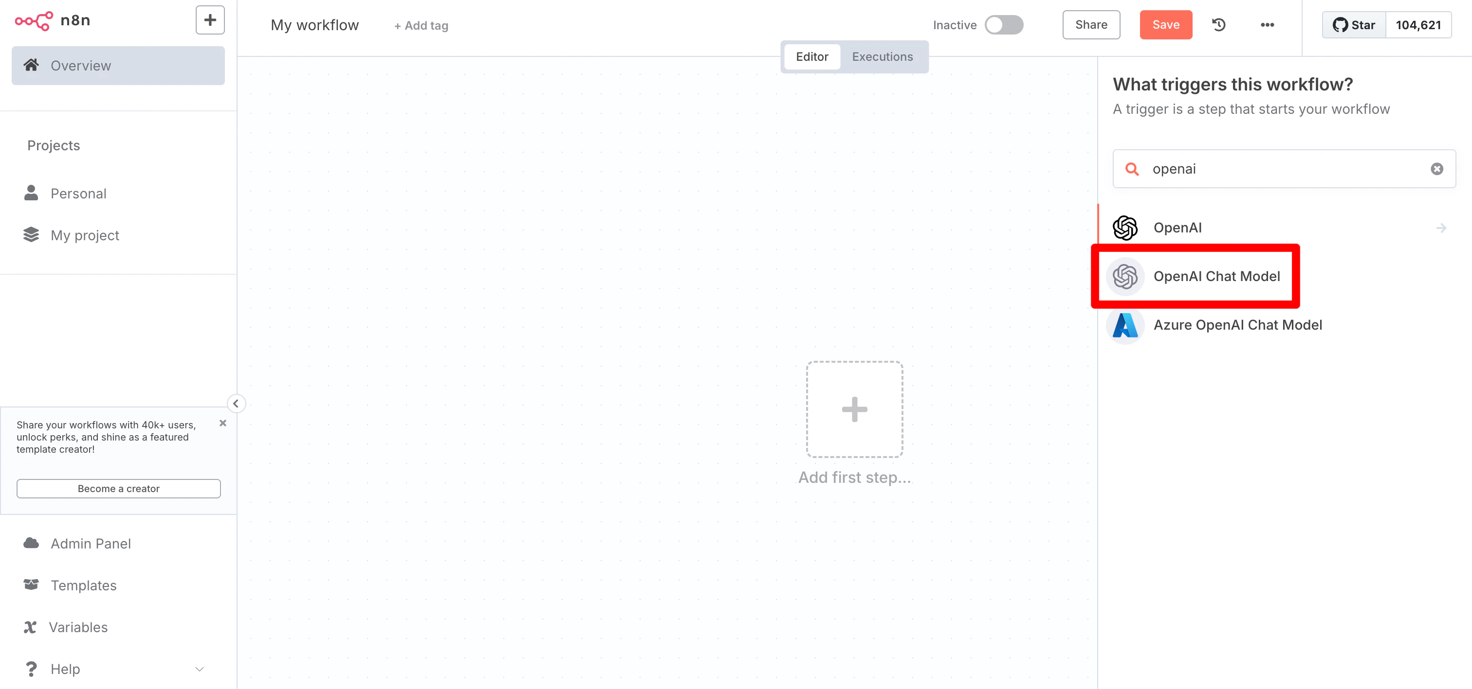 To integrate SambaCloud with n8n, follow these steps:Open or create workflow